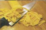 - Лист нарезать на прямоугольники, положить их на китарру, присыпать сверху мукой и пройтись скалкой, выдавив пасту вниз. Можно нарезать пасту машинкой или большим острым ножом, хорошо пересыпав тесто манкой и свернув пласт вдоль середины с двух сторон рулетами к центру.